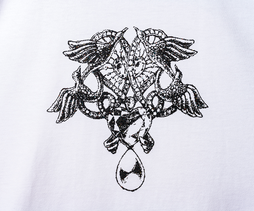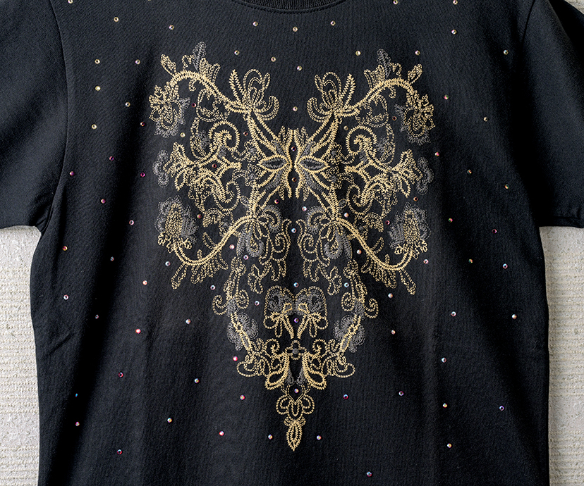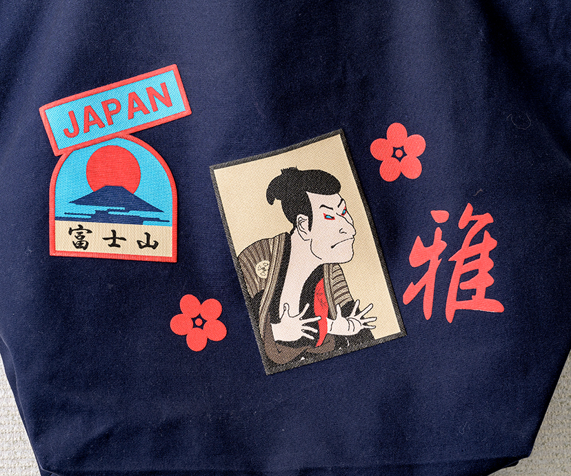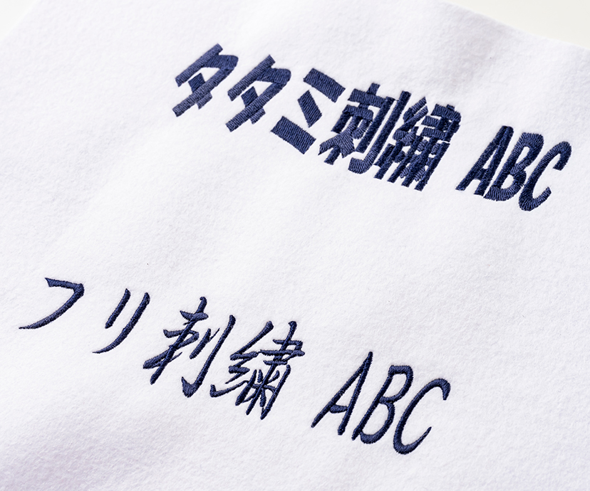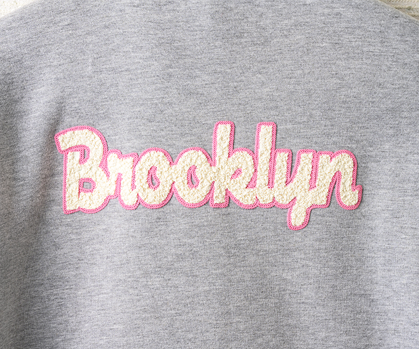 様々な刺繍手法を、製版技術と発泡プリントを使ってワッペン調に表現しています。フェイク加工としての面白さもある加工です。