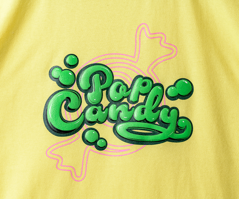 発泡インクを使い、ぷっくりとしたモコモコした仕上がりにしています。デザインに合わせて普通のラバープリントと組み合わせて使...