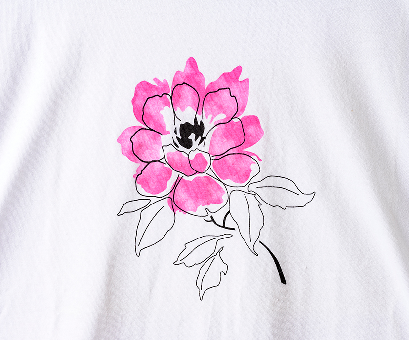 ラバーと並んでポピュラーな手法です。柔らかく染み込むインクを使用します。淡色生地にのみ可能なプリント手法です。