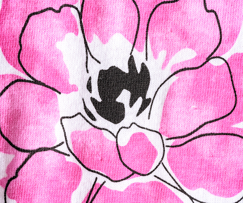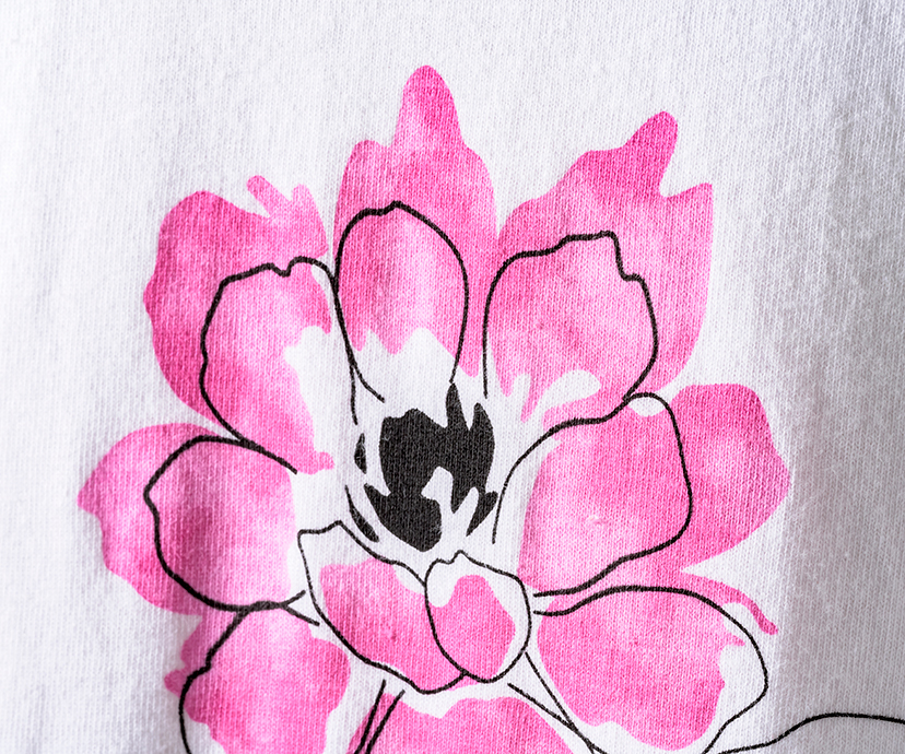 ぼかしプリントは、手描き風にプリントカラーを境目の無い濃淡で表現する技法です。アミ点で表現するのではなく、名前の通り、色がぼやけて、じんわりとにじむような色の変化が柔らかく、とてもやさしいタッチになります。グラデーションや和柄などに適しています。