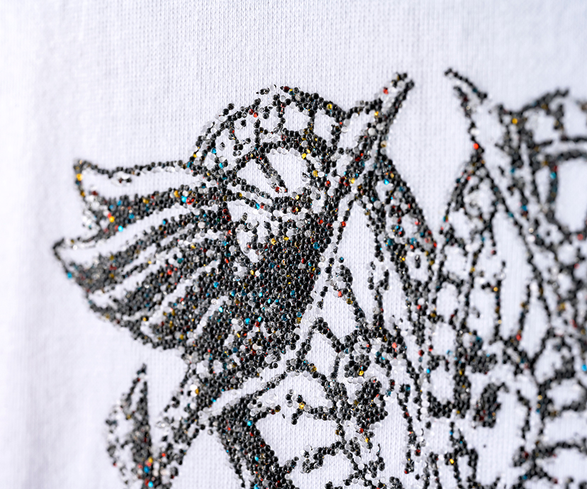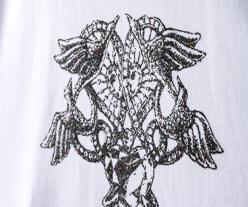 特殊プリント ガラスビーズプリント 直径0.6~0.8cm大のガラスビーズをモチーフの表面に均一に敷き詰めたプリントです。透明度が高く、下地にプリントを刷った上への加工も可能なため、様々な表現が可能です。 ◀ ぼかしプリントクラックプリント ▶ このカテゴリーのトップに戻る