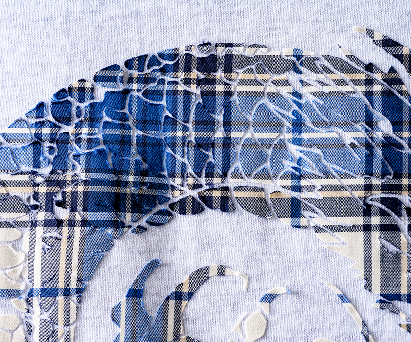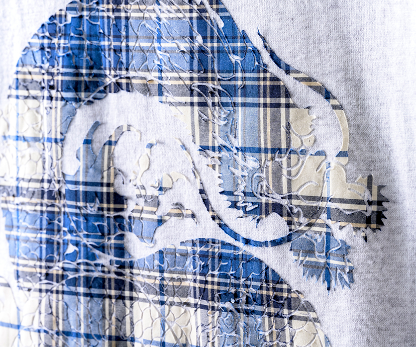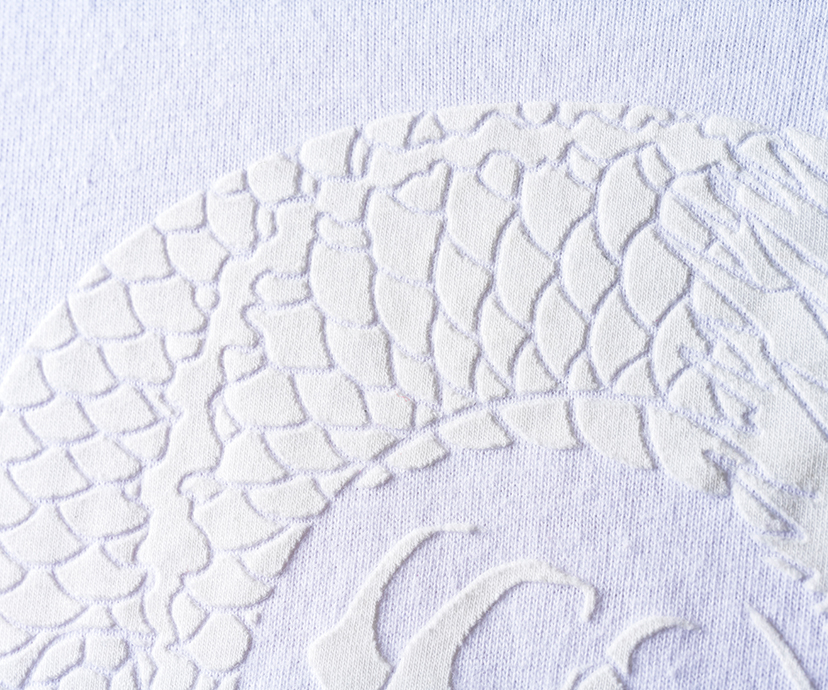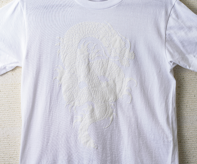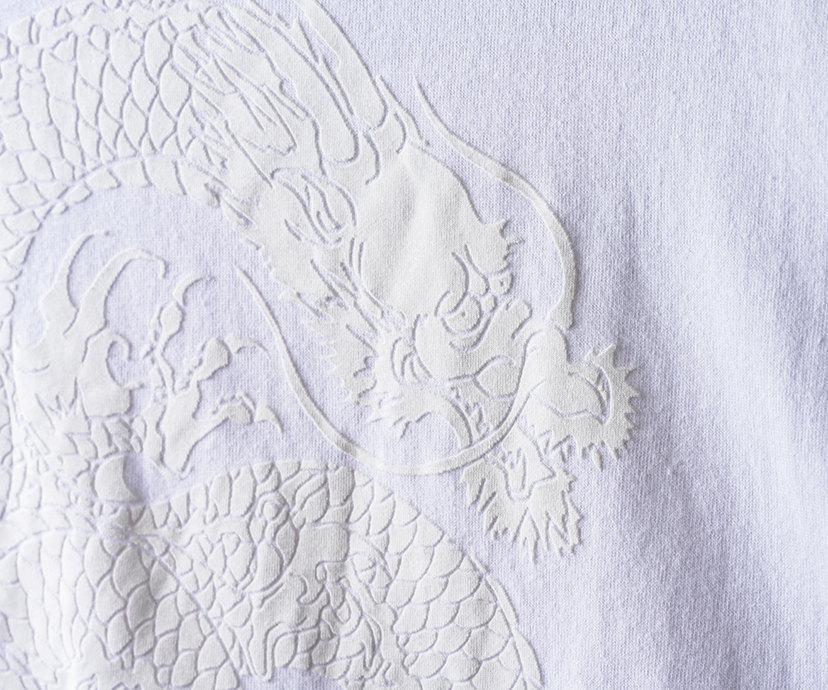 スティック加工は、製品と生地を貼り付けあわせた(ボンディング)商品です。特殊加工方法によりプリントとは違う、製品との一体感を持った立体表現のできる商品です。今までインクのベタで表現していた柄などを生地の素材を活かして表現します。縫い合わせの仕上がりとは異なり、ステッチ不要で軽く生地そのものや柄が印象的に仕上がります。