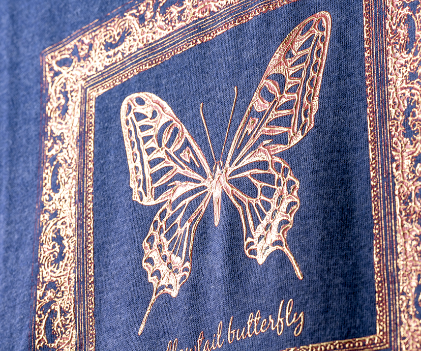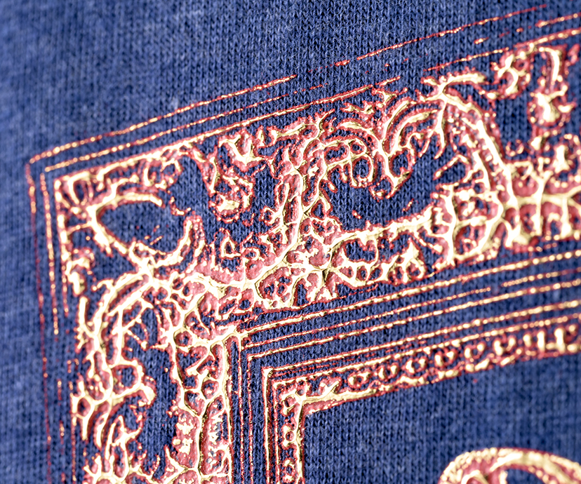 転写加工 箔転写|アンティークフォイル箔 凹凸を持たせたプリントの凸部分のみに箔をつけました。アンティーク家具のような重厚感のある仕上がりが特徴です。下のプリントと上の箔のカラーの組み合わせによって渋めのものから奇抜なものまで様々な表現が可能です。 ◀ 箔転写|キューブ箔箔転写|ビンテージ箔(シワ箔) ▶ このカテゴリーのトップに戻る